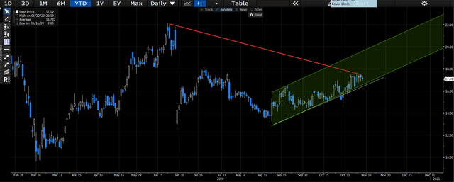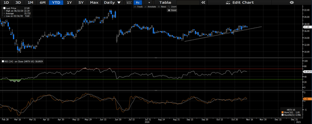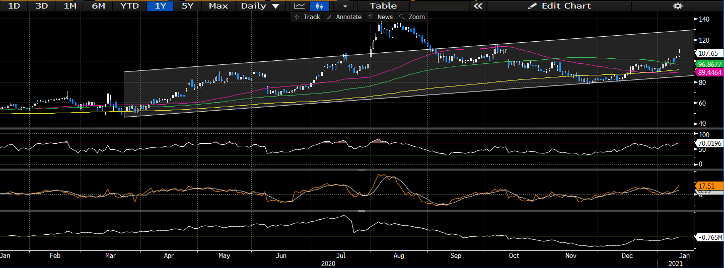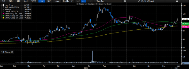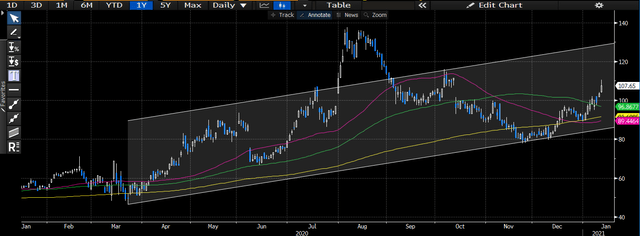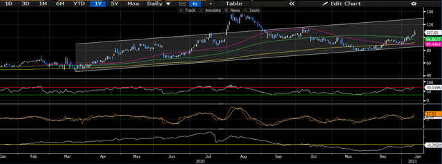 На графиках акции продолжили движение на север после распродажи в марте 2020 года, но не раньше, чем в сентябре 2020 года произошел большой откат. С тех пор акции восстановились к уровню сопротивления и торгуются выше всех скользящих средних. как хороший знак поддержки. Мы считаем, что акции снова будут протестированы на уровне сопротивления 2020 года, который мы определяем на уровне ~ 125-130 долларов. Учитывая, что общая волатильность в течение этого периода тестирования была низкой, хотя и достаточно равномерно балансировала между положительной и отрицательной сторонами, мы ожидаем, что в долгосрочном плане удорожание акций продолжится по текущей траектории.