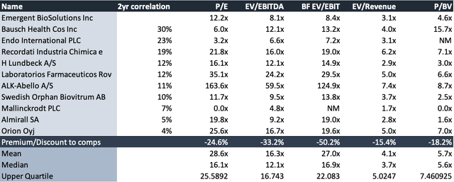 В нашем предыдущем анализе мы призывали к оценке в ~ 126 долларов, что представляет значительный потенциал роста на основе DCF. Мы по-прежнему уверены в том, что акции сегодня стоят ~ 120 долларов, особенно с учетом дополнительных возможностей в CDMO, которые компенсируют слабость в других сегментах. Акции также торгуются с ~ 12x P / E, 8x EBITDA за 3 квартал и чуть более 3x продажами. Мы видим, что акции, дисконтированные по сравнению с группой аналогов, торгуются с солидным дисконтом по большинству мультипликаторов. Например, торговля по балансовой стоимости в 4,6 раза означает отличное создание ценности для держателей акций, в то же время со скидкой ~ 18% по сравнению с аналогами. Более того, распределение цен остается в значительной степени некоррелированным с группой аналогов, при этом основные факторы, влияющие на оценку и ценовые характеристики, являются идиосинкразическими по своей природе, что дает инвесторам хорошую возможность держать EBS и при этом получать выгоду от отраслевой диверсификации.