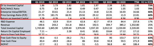 Наш пример оценки добавляет веса тому, что ROIC был важным фактором для результатов оценки в предыдущие периоды. ROIC также оставался высоким в эти периоды, особенно в течение 2020 года, в диапазоне 5-10%. Мы ищем компании, которые последовательно и / или постепенно демонстрируют высокие показатели ROIC, чтобы оправдать любое кратное увеличение и увеличение стоимости. Таким образом, ROIC обеспечил не менее 60% ключевых множественных результатов за предыдущие периоды, включая EV / инвестированный капитал. ROIC также обеспечил по крайней мере 60-70% конверсии бесплатных денежных средств за этот период. Таким образом, мы считаем, что, учитывая недавние контракты и приоритетБлагодаря высокодоходному сегменту CDMO, EBS имеет хорошие возможности для достижения положительных результатов в оценке и удорожании акций. Инвесторы могут видеть эти результаты на диаграмме ниже, которая использует результаты TTM в расчетах.