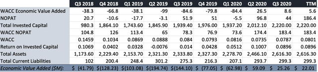 Более того, руководство продемонстрировало свою способность раскрыть акционерную стоимость в 2020 году, достигнув поворотного момента в добавленной экономической стоимости («EVA») ко второму кварталу. Здесь мы видим, что рентабельность вложенного капитала создает дополнительную стоимость сверх стоимости капитала, используемого в процессе, при этом компания размещает ~ 22 миллиона долларов в EVA по данным TTM. Мы считаем, что это еще больше укрепляет потенциал роста, поскольку компания генерирует остаточные денежные средства от операций, превышающих стоимость капитала и после налогообложения. По нашей оценке, это влияет на картину оценки и, следовательно, на создание стоимости для будущих акционеров.
